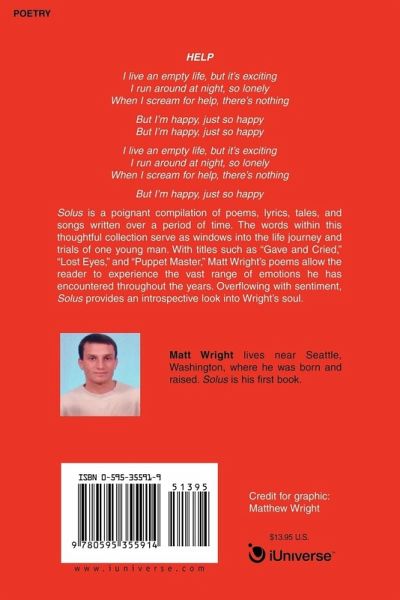 HELP I live an empty life, but it's exciting I run around at night, so lonely When I scream for help, there's nothing But I'm happy, just so happy But I'm happy, just so happy I live an empty life, but it's exciting I run around at night, so lonely When I scream for help, there's nothing But I'm happy, just so happy Solus is a poignant compilation of poems, lyrics, tales, and songs written over a period of time. The words within this thoughtful collection serve as windows into the life journey and trials of one young man. With titles such as 'Gave and Cried," 'Lost Eyes," and 'Puppet Master," Matt Wright's poems allow the reader to experience the vast range of emotions he has encountered throughout the years. Overflowing with sentiment, Solus provides an introspective look into Wright's soul.