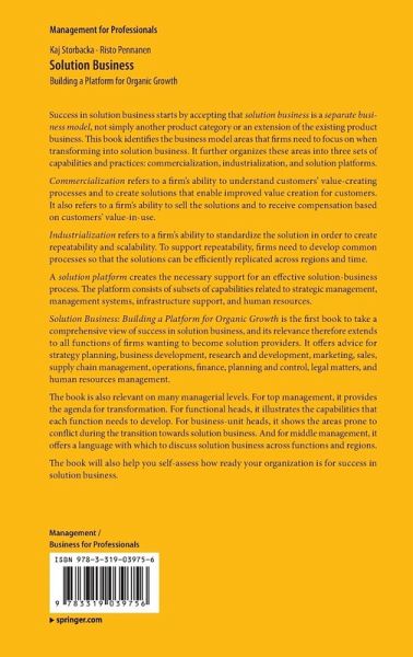Success in solution business starts by accepting that solution business is a separate business model, not simply another product category or an extension of the existing product business. This book identifies the business model areas that firms need to focus on when transforming into solution business. It further organizes these areas into three sets of capabilities and practices: commercialization, industrialization and solution platforms. This is the first book to take a comprehensive view of success in solution business and its relevance therefore extends to all functions of firms wanting to become solution providers as well as to many managerial levels. The book will also help you self-assess how ready your organization is for success in solution business.