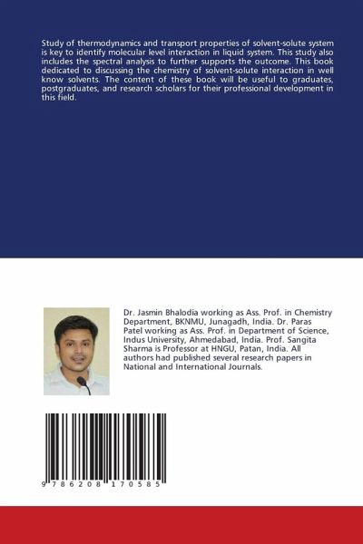 Study of thermodynamics and transport properties of solvent-solute system is key to identify molecular level interaction in liquid system. This study also includes the spectral analysis to further supports the outcome. This book dedicated to discussing the chemistry of solvent-solute interaction in well know solvents. The content of these book will be useful to graduates, postgraduates, and research scholars for their professional development in this field.