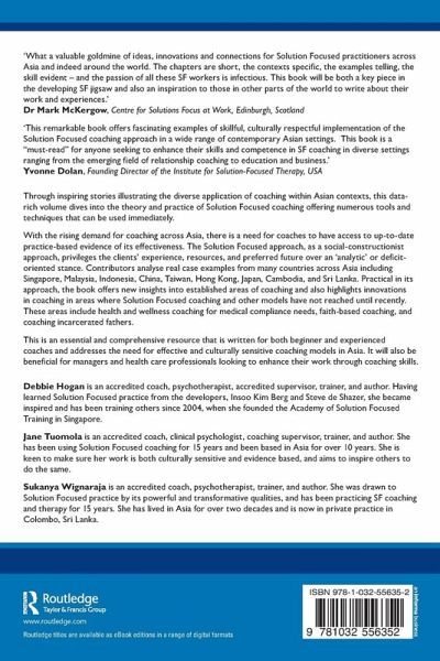 Debbie Hogan is an accredited coach, psychotherapist, accredited supervisor, trainer, and author. Having learned Solution Focused practice from the developers, Insoo Kim Berg and Steve de Shazer, she became inspired and has been training others since 2004, where she founded the Academy of Solution Focused Training in Singapore. Jane Tuomola is an accredited coach, clinical psychologist, coaching supervisor, trainer, and author. She has been using Solution Focused coaching for 15 years and been based in Asia for over 10 years. She is keen to make sure her work is both culturally sensitive and evidence based, and aims to inspire others to do the same. Sukanya Wignaraja is an accredited coach, psychotherapist, trainer, and author. She was drawn to Solution Focused practice by its powerful and transformative qualities, and has been practicing SF coaching and therapy for 15 years. She has lived in Asia for over two decades and is now in private practice in Colombo, Sri Lanka.