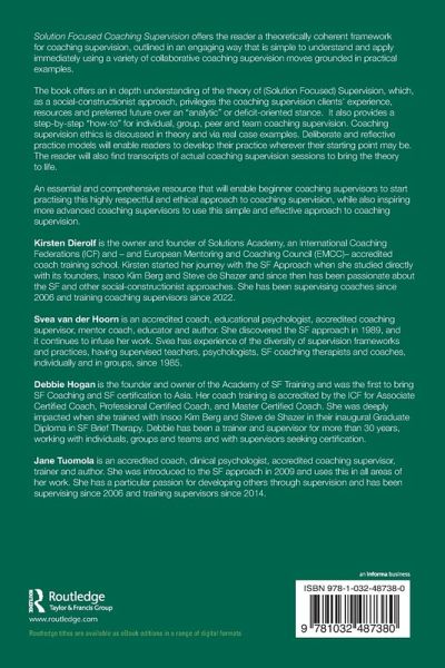 "This is a welcome addition to the literature on Coaching Supervision . It's a great resource that will enable coaches and supervisors to find the best support for themselves and to explore different approaches that will add to their knowledge and CPD. It offers a detailed description of Solution Focused Coaching Supervision for both individuals and groups. It includes case studies to bring the subject to life. This book will help to raise the global profile of Supervision."
