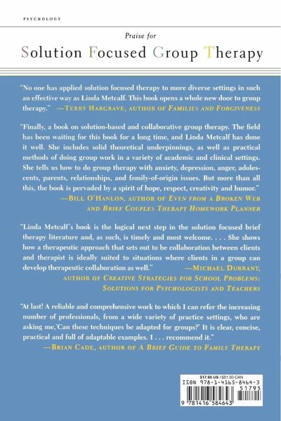In our managed care era, group therapy, long the domain of traditional psychodynamically oriented therapists, has emerged as the best option for millions of Americans. However, the process can be frustratingly slow, and studies show that patients actually feel worse after months of group treatment than when they began. Can and should "the group" speed a person's progress? Now, in this "must have" book, marriage and family therapist Linda Metcalf persuasively argues that the collaborative nature of group therapy actually lends itself to time-limited treatment. She combines the best elements of group work and the popular solution focused brief therapy approach to create new opportunities for practitioners and patients alike.Among the topics covered in this valuable guide are:how to learn the modelhow to design a group and recruit membershow to identify exceptions to a group member's self-destructive behaviors and thoughtshow to help members focus on their successes rather than their failureshow to keep the group solution focused when therapists or members fall back into old patternsThis unique resource also includes case examples and session transcripts to follow, together with reproducible forms that can be used as they are or tailored to a therapist's needs. Solution Focused Group Therapy is an up-to-the-minute, highly accessible resource for therapists of any orientation. Managed care companies in particular will welcome this model, which deals so effectively and economically with today's biggest problems, including eating disorders, chemical dependencies, grief, depression, anxiety, and sexual abuse.