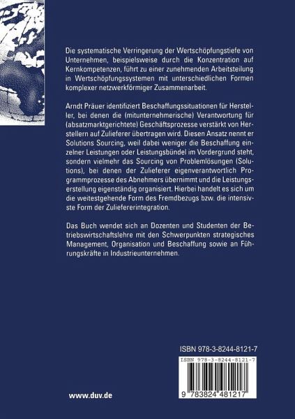 Arndt Präuer identifiziert Beschaffungssituationen für Hersteller, bei denen die (mitunternehmerische) Verantwortung für (absatzmarktgerichtete) Geschäftsprozesse verstärkt von Herstellern auf Zulieferer übertragen wird. Diesen Ansatz nennt er Solutions Sourcing, weil dabei weniger die Beschaffung einzelner Leistungen oder Leistungsbündel im Vordergrund steht, sondern vielmehr das Sourcing von Problemlösungen (Solutions), bei denen der Zulieferer eigenverantwortlich Programmprozesse des Abnehmers übernimmt und die Leistungserstellung eigenständig organisiert. Hierbei handelt sich um die weitestgehende Form des Fremdbezugs bzw. die intensivste Form der Zuliefererintegration.