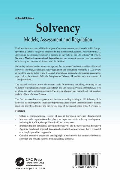 Until now there were no published analyses of the recent solvency work conducted in Europe, specifically the risk categories proposed by the IAA. Answering the insurance industry's demand in the wake of the EU Solvency II project, Solvency: Models, Assessment and Regulation provides a concrete summary and review of solvency. Following an introduction to the concept, the first section of the book provides a historical review of solvency. The second section explores the current basis for solvency modeling, and the final section discusses groups and internal modeling as it relates to EU Solvency II.