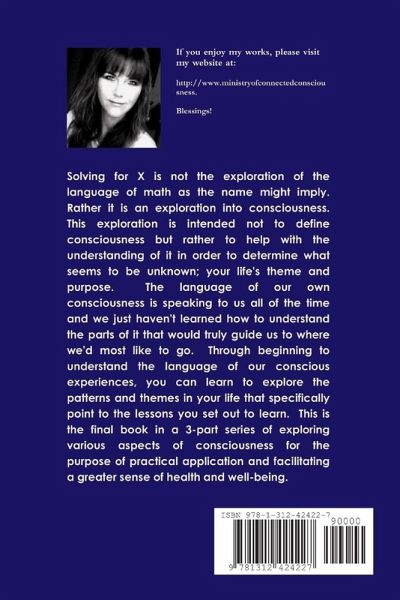 Solving for X is not the exploration of the language of math as the name might imply. Rather it is an exploration into consciousness. This exploration is intended not to define consciousness but rather to help with the understanding of it in order to determine what seems to be unknown; your life's theme and purpose. The language of our own consciousness is speaking to us all of the time and we just haven't learned how to understand the parts of it that would truly guide us to where we'd most like to go. Through beginning to understand the language of our conscious experiences, you can learn to explore the patterns and themes in your life that specifically point to the lessons you set out to learn. This is the final book in a 3-part series of exploring various aspects of consciousness for the purpose of practical application and facilitating a greater sense of health and well-being.