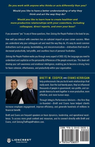 #1 on Entrepreneur Magazine's "Must-Read Books for 2021" Do you work with anyone who thinks or acts differently than you? Would you like to understand why they think and act that way? Would you like to have THE answer for how to build more productive relationships with your coworkers (including your boss)? Then Solving the People Problem is for you. By sharing their own personal insights - gained over two decades as Organizational Health Consultants - and more than twenty interesting and often humorous anecdotes from others, Brett M. Cooper and Evans Kerrigan explain the what, why and how of DISC-EQ, a powerful new framework that will equip you to master six essential workplace applications: Decision making Communicating with others Handling conflict Teamwork Sales & customer service Leadership FREE BONUS: The companion Emotional Intelligence survey is available at SolvingThePeopleProblem.com. Look for the "What's My DISC-EQ?" link to gain new insights for how you can be more effective.