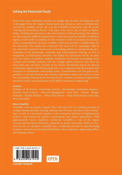 Every four years, Schaeffler provides an insight into its latest developments and technologies from the engine, transmission and chassis as well as hybridization and electric mobility sectors. In 2014 the Schaeffler Symposium with the motto "Solving the Powertrain Puzzle" took place from 3th to 4th of April in Baden-Baden. Mobility for tomorrow is the central theme of this proceeding. The authors are discussing the different requirements, which are placed on mobility in different regions of the world. In addition to the company's work in research and development, a comprehensive in-house mobility study also provides a reliable basis for the discussion. The authors are convinced that there will be a paradigm shift in the automotive industry. Issues such as increasing efficiency and advancing electrification of the powertrain, automatic and semi-automatic driving, as well as integration in information networks will define the automotive future. In addition, the variety of solutions available worldwide will become increasingly more complex and mobility patterns will also change rapidly. However, this does not mean that cars will drive virtually in the future. Powertrains based on internal combustion engines will still dominate for a very long time and demonstrate new strengths in combination with hybrid drives. Transmissions will also gain in importance as the link between the internal combustion engine and electric motor. The proceeding "Solving the Powertrain Puzzle" contains 34 technical papers from renowned experts and researchers in the field of automotive engineering.