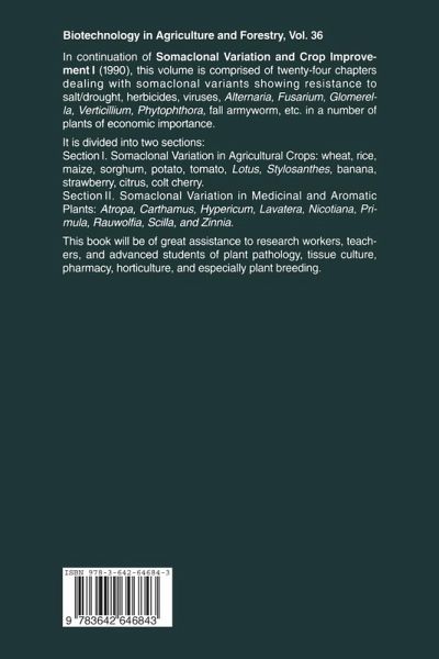 In continuation of Somaclonal Variation and Crop Improvement I (1990), this volume is comprised of twenty-four chapters dealing with somaclonal variants showing resistance to salt/drought, herbicides, viruses, Alternaria, Fusarium, Glomerella, Verticillium, Phytophthora, fall armyworm, etc. in a number of plants of economic importance.