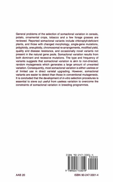 Welcome Address.- Welcome Address.- General Problems of Selection of Somaclonal Uariants.- Tissue Culture and Crop Improvement Scientific Dream or New Science ?.- Limitations to the Use of Somaclonal Variation in Crop Improvement.- Chromosome Variation in Plants Regenerated From Protoplasts and Cultured Plant Tissues.- In Vitro Selection for Resistance.- Double-Layer Culture Technique as a Tool for the Selection of Calluses Resistant to Toxic Material from Plant Pathogenic Fungi.- - Non Mendelian Heredity - Genetic Analysis of Variant Plants Regenerated from in vitro Culture : Epigenetics and Epigenic.- Experimental and Theoretical Approach of in vitro Variations.- A Breeder's Point of View about New Breeding Tools.- Somaclonal Variations in Cereals.- Relative Genetic Stability of Embryogenic Cultures of the Gramineae and Uniformity of Regenerated Plants.- In Vitro Manipulation of Cereal Crops.- Somaclonal Variation in Wheat.- Gametoclonal Variations in Doubled Haploids of Wheat : Biometrical and Molecular Aspects.- Molecular Changes and Possible Origins of Somaclonal Variation.- Somaclonal and Gametoclonal Variation in Wheat, Cotton and Brassica.- Genotype Specific Changes in Amino Acid and Polyamine of Wheat Tissue Culture Induced by Osmotic Stress.- Somaclonal Variation Applied To Wheat Breeding.- In Vitro Regeneration of Plants from Calluses of Triticum Aestivum Cultivars.- Somaclonal Variations in Potato.- Origin and Nature of Somaclonal Variation in Potato.- Variation in the Tissue Culture Progeny of the Chimeral Potato (Solanum Tuberosum L.) Variety Golden Wonder.- Genetic Instability in Vitro of Monohaploid, Dihaploid and Tetraploid Genotypes of Potato.- Selection of Variants by Dual Cultures of Potato and Phytophthora Infestans.- Effects of in VitroDifferentiation on Genetic Stability in Potato.- Characterization of Somaclonal Variations in Potato: A Biochemical Approach.- The Evaluation of Potato Somaclones.- Cryopreservation of Potato Somaclones.- Somaclonal Variations in Ornemental Crops.- Interclonal Variability Induced by in vitro and in vivo Propagation in a Vegetatively Propagated Plant, the Carnation.- Somaclonal Variation in Some Cultivars of Fuchsia.- Somaclonal Variations in Tobacco.- Cellular Engineering by Means of Gamma Fusion : Genetic Variation in Fusion Products.- Nitrate Reductase-Deficient Mutants of Nicotiana Plumbaginifolia.- Valine-Resistant Plants of Nicotiana Plumbaginifolia.- Concluding Remarks.- Concluding Remarks.
