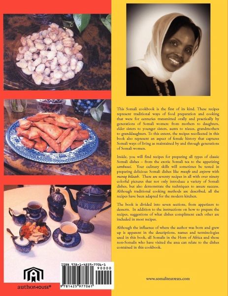 This Somali cookbook is the first of its kind. These recipes represent traditional ways of food preparation and cooking that were for centuries transmitted orally[1] and practically by generations of Somali women: from mothers to daughters, elder sisters to younger sisters, aunts to nieces, grandmothers to granddaughters. To this extent, the recipes recollected in this book also represent an aspect of female history that captures Somali ways of living as maintained by and through generations of Somali women. Inside, you will find recipes for preparing all types of classic Somali dishes - from the exotic Somali tea to the appetizing sambuusi. Your culinary skills will sometimes be tested in preparing delicious Somali dishes like anjero with maraq bilaash. There are seventy recipes in all with over ninety colorful pictures that not only introduce a variety of Somali dishes, but also demonstrate the techniques to assure success. Although traditional cooking methods are described, all the recipes have been adapted for the modern American kitchen. The book is divided into seven sections, from appetizers to desserts. In addition to the instructions on how to prepare the recipes, suggestions of what dishes compliment each other are included in most recipes. Although the influence of where the author was born and grew up is apparent in the descriptions, names and terminologies used in this book, all Somalis in the Horn of Africa and those non-Somalis who have visited the area can relate to the dishes contained in this cookbook. My best wishes. ENJOY!! -------------------------------------------------------------------------------- [1] The Somali language was only spoken until the early 1970s.