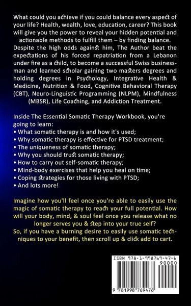 What could you achieve if you could balance every aspect of your life? Health, wealth, love, education, career? This book will give you the power to reveal your hidden potential and actionable methods to fulfill them - by finding balance. Despite the high odds against him, The Author beat the expectations of his forced repatriation from a Lebanon under fire as a child, to become a successful Swiss businessman and learned scholar gaining two masters degrees and holding degrees in Psychology, Integrative Health & Medicine, Nutrition & Food, Cognitive Behavioral Therapy (CBT), Neuro-Linguistic Programming (NLPM), Mindfulness (MBSR), Life Coaching, and Addiction Treatment. Inside The Essential Somatic Therapy Workbook, you're going to learn:What somatic therapy is and how it's used; Why somatic therapy is effective for PTSD treatment; The uniqueness of somatic therapy; Why you should trust somatic therapy; How to carry out self-somatic therapy; Mind-body exercises that help you heal on time; Coping strategies for those living with PTSD; And lots more! Imagine how you'll feel once you're able to easily use the magic of somatic therapy to reach your full potential. How will your body, mind, & soul feel once you release what no longer serves you & step into your true self? So, if you have a burning desire to easily use somatic techniques to your benefit, then scroll up & click add to cart.