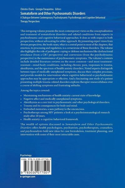 The wealth of options discussed in Somatoform and Psychosomatic Disorders offers health psychologists, psychiatrists, psychotherapists, counselors, and psychoanalysts bold new ideas for case formulation, treatment planning, and intervention with some of their most intractable cases.
