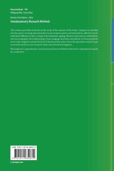 Detection, discrimination & localisation: The psychophysics of touch.- Methods of somatosensory attenuation.- Muscle Tendon Vibration: A Method for Estimating Kinaesthetic perception.- Creating tactile motion.- Measuring Tactile Distance Perception.- Affective Touch: Psychophysics, Physiology and Vicarious Touch Perception.- Qualia, brain waves and spinal reflexes: The study of pain perception by means of subjective reports, electroencephalography and electromyography.- The many challenges of human experimental itch research.- Experimental framework and methods for the assessment of skin wetness sensing in humans.- Skin-mediated interoception: The perception of affective touch and cutaneous pain.- Atypical development of tactile processing.- Measuring Touch Sensitivity in an Ageing Population.- Somatosensory illusions.- Sensory Substitution: Visual information via haptics.- Microneurography: Recordings from single neurons in human peripheral nerves.- Electrophysiological techniques for studying tactile perception in rats.- Imaging somatosensory cortex in rodents.- Imaging somatosensory cortex: human functional magnetic resonance imaging (fMRI).- Electroencephalography of Touch.- Neurostimulation in tactile perception.