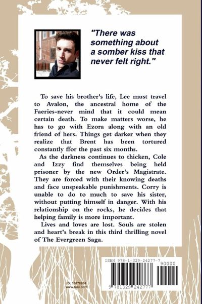 To save his brother's life, Lee must travel to Avalon, the ancestral home of the Faeries-never mind that it could mean certain death. To make matters worse, he is accompanied by Ezora along with an old friend of hers. Things get darker when they realize that Brent has been tortured constantly for the past six months. As the darkness continues to thicken, Cole and Izzy find themselves being held prisoner by the new Order Magistrate. They are forced with their knowing deaths and unspeakable punishments. Corry is unable to do much to save them at first, but soon realizes that he has to make a choice. The love of his life, or family? Things couldn't seem to get any worse for everyone, that is until Melanie gets possessed by a dark spirit. Driven into madness and murder Melanie goes on a quest for vengeance. Only finding the truth behind the spirit's motives. Live are no longer safe, loves are no longer sacred and hearts are pushed to the edge in this third installment to The Evergreen Saga.