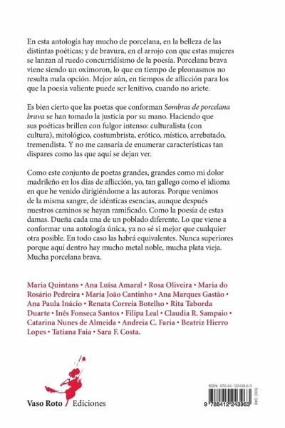 En esta antología hay mucho de porcelana, en la belleza de las distintas poéticas; y de bravura, en el arrojo con que estas mujeres se lanzan al ruedo concurridísimo de la poesía. Porcelana brava viene siendo un oxímoron, lo que en tiempo de pleonasmos no resulta mala opción. Mejor aún, en tiempos de aflicción para los que la poesía valiente puede ser lenitivo, cuando no ariete. Maria Quintans ¿ Ana Luísa Amaral ¿ Rosa Oliveira ¿ Maria do Rosário Pedreira ¿ Maria João Cantinho ¿ Ana Marques Gastão ¿ Ana Paula Inácio ¿ Renata Correia Botelho ¿ Rita Taborda Duarte ¿ Inês Fonseca Santos ¿ Filipa Leal ¿ Claudia R. Sampaio ¿ Catarina Nunes de Almeida ¿ Andreia C. Faria ¿ Beatriz Hierro Lopes ¿ Tatiana Faia ¿ Sara F. Costa.