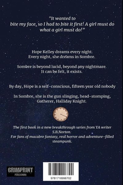 Hope Kelley dreams every night. Every night, she dreams in Sombre. Sombre is beyond lucid, beyond any nightmare. It can be felt, it exists. Each dream is a mission. Every nightmare is horrific and plays out to a violent end. In her waking world, Hope is a nearsighted fifteen-year-old-nobody, who spends her days as an estranged member of her own family and a ghost at her new school, Centurion High. In Sombre she is Gatherer, Halliday Knight - her complete gunslinging, head-stomping, liquor swilling, magnificent opposite. Aboard her machanihorse, Wilder, she serves Sombre, gathering Nightmarers, the world's troubled sleepers, with her very own breed of unashamed violence, folly and charm. An existence in Sombre can be fleeting, as everyone; Gatherer, monster, animal and miscreant alike, live with twelve strokes on their Beating Clock, a timepiece embedded in the chest. Sombre's Mender's monitor and regulate each citizen's existence. Every new stroke a Mender sets on a citizen's Beating Clock, means a stroke closer to the end of their time in the nightmare world. Hope's sleeping world clashes with her waking world when she meets the cool and uninhibited Parker Wright, a cheerleader, a year above her at Centurion High School, a rebel in every sense of the word. Parker has been touched by Sombre as well. An unexplained and horrific attack of a male student at Centurion involves Hope, just as a seemingly unstoppable threat comes to Sombre. The same threat invades Hope's waking existence in Pento; signifying the beginning to a wild journey on a road of intertwining realities. For fans of macabre fantasy, real horror and adventured filled steampunk from YA author S.B.Norton.