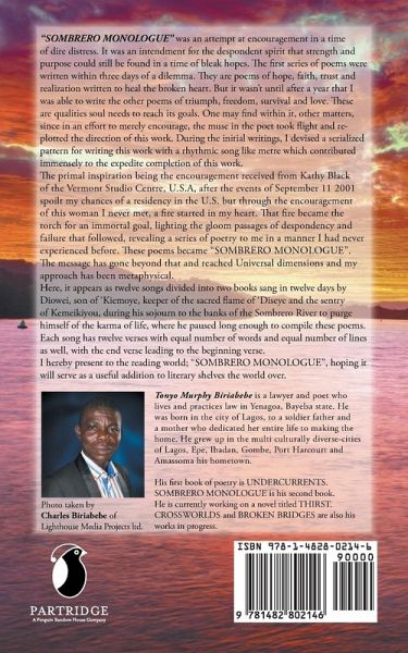 "SOMBRERO MONOLOGUE" was an attempt at encouragement in a time of dire distress. It was an intendment for the despondent spirit that strength and purpose could still be found in a time of bleak hopes. The first series of poems were written within three days of a dilemma. They are poems of hope, faith, trust and realization written to heal the broken heart. But it wasn't until after a year that I was able to write the other poems of triumph, freedom, survival and love. These are qualities soul needs to reach its goals. One may find within it, other matters, since in an effort to merely encourage, the muse in the poet took flight and re-plotted the direction of this work. During the initial writings, I devised a serialized pattern for writing this work with a rhythmic song like metre which contributed immensely to the expedite completion of this work. The primal inspiration being the encouragement received from Kathy Black of the Vermont Studio Centre, U.S.A, after the events of September 11 2001 spoilt my chances of a residency in the U.S. but through the encouragement of this woman I never met, a fire started in my heart. That fire became the torch for an immortal goal, lighting the gloom passages of despondency and failure that followed, revealing a series of poetry to me in a manner I had never experienced before. These poems became "SOMBRERO MONOLOGUE". The message has gone beyond that and reached Universal dimensions and my approach has been metaphysical. Here, it appears as twelve songs divided into two books sang in twelve days by Diowei, son of 'Kiemoye, keeper of the sacred flame of 'Diseye and the sentry of Kemeikiyou, during his sojourn to the banks of the Sombrero River to purge himself of the karma of life, where he paused long enough to compile these poems. Each song has twelve verses with equal number of words and equal number of lines as well, with the end verse leading to the beginning verse. I hereby present to the reading world; "SOMBRERO MONOLOGUE", hoping it will serve as a useful addition to literary shelves the world over.