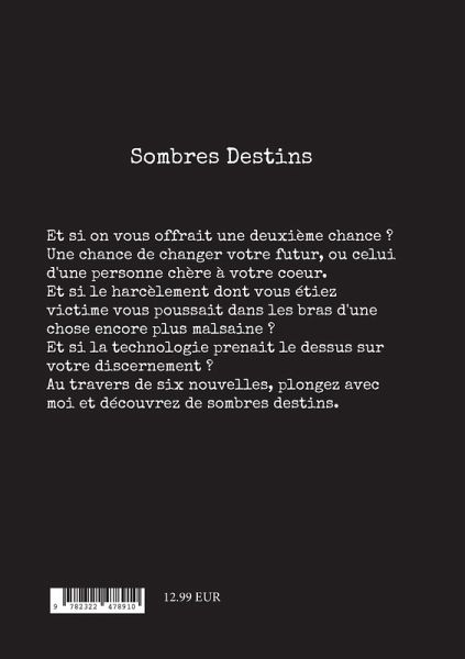 Et si on vous offrait une deuxième chance ? Une chance de changer votre futur, ou celui d'une personne chère à votre coeur. Et si le harcèlement dont vous étiez victime vous poussait dans les bras d'une chose encore plus malsaine ? Et si la technologie prenait le dessus sur votre discernement ? Au travers de six nouvelles, plongez avec moi et découvrez de sombres destins.