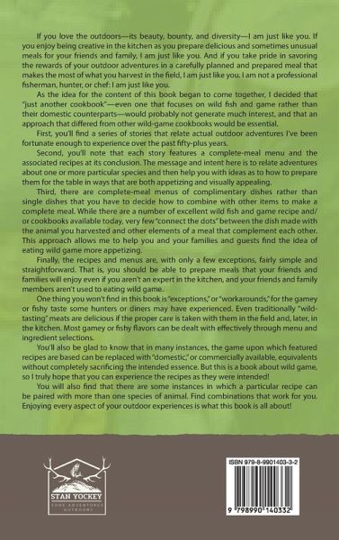 If you love the outdoors--its beauty, bounty, and diversity--I am just like you. If you enjoy being creative in the kitchen as you prepare delicious and sometimes unusual meals for your friends and family, I am just like you. And if you take pride in savoring the rewards of your outdoor adventures in a carefully planned and prepared meal that makes the most of what you harvest in the field, I am just like you. I am not a professional fisherman, hunter, or chef: I am just like you. As the idea for the content of this book began to come together, I decided that "just another cookbook"--even one that focuses on wild fish and game rather than their domestic counterparts--would probably not generate much interest, and that an approach that differed from other wild-game cookbooks would be essential. First, you'll find a series of stories that relate actual outdoor adventures I've been fortunate enough to experience over the past fifty-plus years. Second, you'll note that each story features a complete-meal menu and the associated recipes at its conclusion. The message and intent here is to relate adventures about one or more particular species and then help you with ideas as to how to prepare them for the table in ways that are both appetizing and visually appealing. Third, there are complete-meal menus of complimentary dishes rather than single dishes that you have to decide how to combine with other items to make a complete meal. While there are a number of excellent wild fish and game recipe and/or cookbooks available today, very few "connect the dots" between the dish made with the animal you harvested and other elements of a meal that complement each other. This approach allows me to help you and your families and guests find the idea of eating wild game more appetizing. Finally, the recipes and menus are, with only a few exceptions, fairly simple and straightforward. That is, you should be able to prepare meals that your friends and families will enjoy even if you aren't an expert in the kitchen, and your friends and family members aren't used to eating wild game. One thing you won't find in this book is "exceptions," or "workarounds," for the gamey or fishy taste some hunters or diners may have experienced. Even traditionally "wild-tasting" meats are delicious if the proper care is taken with them in the field and, later, in the kitchen. Most gamey or fishy flavors can be dealt with effectively through menu and ingredient selections. You'll also be glad to know that in many instances, the game upon which featured recipes are based can be replaced with "domestic," or commercially available, equivalents without completely sacrificing the intended essence. But this is a book about wild game, so I truly hope that you can experience the recipes as they were intended! You will also find that there are some instances in which a particular recipe can be paired with more than one species of animal. Find combinations that work for you. Enjoying every aspect of your outdoor experiences is what this book is all about!