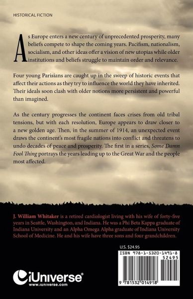As Europe enters a new century of unprecedented prosperity, many beliefs compete to shape the coming years. Pacifism, nationalism, socialism, and other ideas offer a vision of new utopias while older institutions and beliefs struggle to maintain order and relevance. Four young Parisians are caught up in the sweep of historic events that affect their actions as they try to influence the world they have inherited. Their ideals soon clash with older notions more persistent and powerful than imagined. As the century progresses, the continent face crises from old tribal tensions, but with each resolution, Europe appears to draw closer to a new golden age. Then, in the summer of 1914, an unexpected event draws the continent's most fragile nations into conflict and threatens to undo decades of peace and prosperity. The first in a series, Some Damn Fool Thing portrays the years leading up to the Great War and the people most affected.