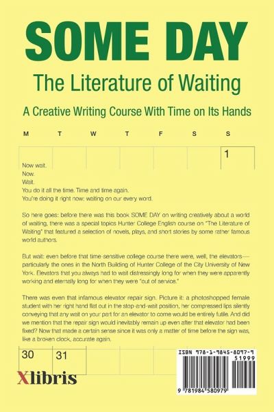 SOME DAY The Literature of Waiting A Creative Writing Course With Time on Its Hands Now wait. Now. Wait. You do it all the time. Time and time again. You're doing it right now: waiting on our every word. So here goes: before there was this book SOME DAY on writing creatively about a world of waiting, there was special topics Hunter College English course on "The Literature of Waiting" that featured a selection of novels, plays, and short stories by some rather famous world authors. But wait: even before that time-sensitive college course there were, well, the elevators-particularly the ones in…mehr