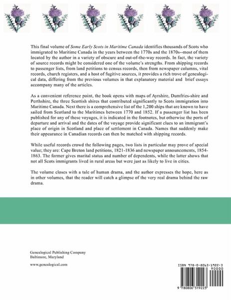 This final volume of "Some Early Scots in Maritime Canada" identifies thousands of Scots who immigrated to Maritime Canada in the years between the 1770s and the 1870s--most of them located by the author in a variety of obscure and out-of-the-way records. In fact, the variety of source records consulted is one of the volume's strengths. From shipping records to passenger lists, from land petitions to census records, then from newspaper columns, vital records, church registers, and a host of fugitive sources, the sources utilized provide a rich trove of genealogical data. This volume differs from the previous volumes in the series in that explanatory material and brief essays accompany many of the articles.