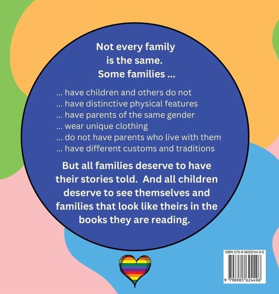 If you're a fan of Todd Parr's messages of acceptance and diversity, you're certain to love this book. Not every family is the same. Some families ... ... have children and others do not ... have parents of the same gender ... wear unique clothing ... have parents who do not live with them ... have different customs and traditions ... look different from one another, ... but all families deserve to have their stories told. And all children deserve to see themselves and families that look like theirs in the books they are reading. The book is a celebration of all diverse families with a goal to create greater representation and visibility for many different types of families. The story uses simple language that could describe any family, complimented by vivid illustrations of a variety of unique family structures. It is an easy-to-read story with captivating illustrations designed to effectively engage the book's target audience - kids between the ages of 2-6. It tells a story that normalizes differences and honors a unique family type on every single page. The story starts with an awareness of differences between Some Families and then moves into the common experiences of All Families that unify us all. The book features a wide range of family types, including:a range of ethnicities and cultures mixed race families same sex parents single parents grandparents serving as parents / multi-generational multi-abled family members and more¿. Author's Note: This book has been nearly 30 years in the making. Some Families, All Families is my love note to the 100s of families I've worked with as a clinical social worker who shared with me they felt invisible. To them, I say "You are seen, you are valued and your story is worth telling."