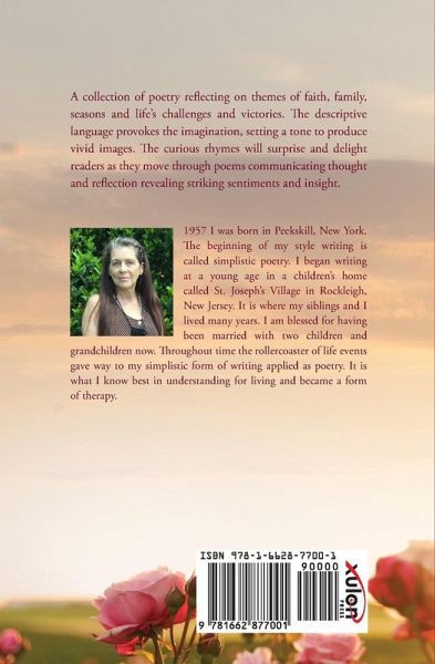 A collection of poetry reflecting on themes of faith, family, seasons and life's challenges and victories. The descriptive language provokes the imagination, setting a tone to produce vivid images. The curious rhymes will surprise and delight readers as they move through poems communicating thought and reflection revealing striking sentiments and insight. 1957 I was born in Peekskill, New York. The beginning of my style writing is called simplistic poetry. I began writing at a young age in a children's home called St. Joseph's Village in Rockleigh, New Jersey. It is where my siblings and I lived many years. I am blessed for having been married with two children and grandchildren now. Throughout time the rollercoaster of life events gave way to my simplistic form of writing applied as poetry. It is what I know best in understanding for living and became a form of therapy.