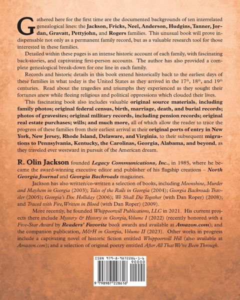 Those relatives, descendants, and researchers interested in the Jackson, Fricks, Neel, Anderson, Hudgins, Tanner, Jordan, Gravatt, Pettyjohn and Rogers family lines will find the material within the pages of this book indispensable - both for permanent family records and a variety of research purposes. This publication represents a once-in-a-lifetime opportunity. Gathered here for the first time not only are the documented life-long activities of and interrelationships between these families, but also an intense historic account of each family, including the fascinating back-stories, coupled with captivating first-person accounts of various members of these families. The author has also provided a complete genealogical break-down for one family line in each family. Read about the unique historic experiences of each of these families, all of which have never before been publicized or related to the public. Records and historic details extend back to the earliest days of the arrival of these families as they immigrated to what today is the United States in the 17th, 18th, and 19th centuries, and the tragedies and triumphs of each as they sought their fortunes while fleeing the religious and political persecutions which clouded their lives. Also detailed within the pages of this book are not only the historic stories and genealogical break-downs, but original reference materials gathered from a variety of sources, including extensive genealogical search engines requiring many hours of research. These documents include fascinating family photographs; original federal census, birth, marriage, death, and burial records; photos of gravesites; military records, including pension records; real estate purchases; wills; and much more. This material will allow the reader to trace the progress of these families from their original ports of entry in New York, New Jersey, Rhode Island, Delaware, and Virginia, to their subsequent migrations to Pennsylvania, Kentucky, the Carolinas, Georgia, Alabama, and beyond, as they traveled ever westward in pursuit of the American dream.