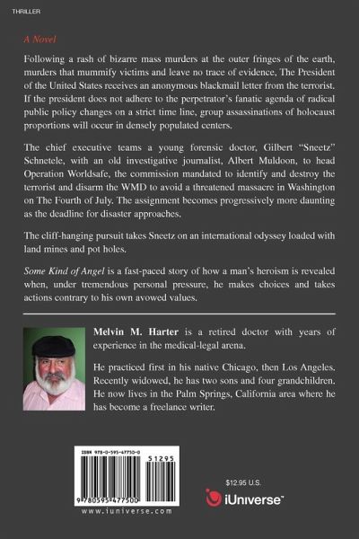 Following a rash of bizarre mass murders at the outer fringes of the earth, murders that mummify victims and leave no trace of evidence, The President of the United States receives an anonymous blackmail letter from the terrorist. If the president does not adhere to the perpetrator's fanatic agenda of radical public policy changes on a strict time line, group assassinations of holocaust proportions will occur in densely populated centers. The chief executive teams a young forensic doctor, Gilbert "Sneetz" Schnetele, with an old investigative journalist, Albert Muldoon, to head Operation Worldsafe, the commission mandated to identify and destroy the terrorist and disarm the WMD to avoid a threatened massacre in Washington on The Fourth of July. The assignment becomes progressively more daunting as the deadline for disaster approaches. The cliff-hanging pursuit takes Sneetz on an international odyssey loaded with land mines and pot holes. Some Kind of Angel is a fast-paced story of how a man's heroism is revealed when, under tremendous personal pressure, he makes choices and takes actions contrary to his own avowed values.