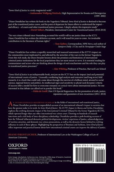 An internationally-renowned scholar in the fields of international and transitional justice, Diane Orentlicher provides an unparalleled account of an international tribunal's impact in societies that have the greatest stake in its work. In Some Kind of Justice: The ICTY's Impact in Bosnia and Serbia, Orentlicher explores the evolving domestic impact of the International Criminal Tribunal for the former Yugoslavia (ICTY), which operated longer than any other international war crimes court. Drawing on hundreds of research interviews and a rich body of inter-disciplinary scholarship, Orentlicher provides a path-breaking account of how the Tribunal influenced domestic political developments, victims' experience of justice, acknowledgement of wartime atrocities, and domestic war crimes prosecutions, as well as the dynamic factors behind its evolving influence in each of these spheres. Highlighting the perspectives of Bosnians and Serbians, Some Kind of Justice offers important and practical lessons about how international criminal courts can improve the delivery of justice.