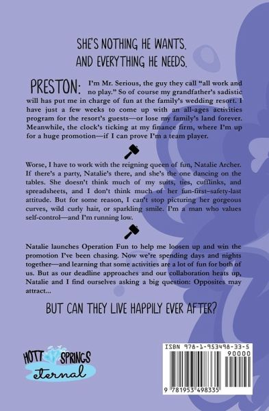 She's nothing he wants. And everything he needs. Preston: I'm Mr. Serious, the guy they call "all work and no play." So of course my grandfather's sadistic will has put me in charge of fun at the family's wedding resort. I have just a few weeks to come up with an all-ages activities program for the resort's guests-or lose my family's land forever. Meanwhile, the clock's ticking at my finance firm, where I'm up for a huge promotion-if I can prove I'm a team player. Worse, I have to work with the reigning queen of fun, Natalie Archer. If there's a party, Natalie's there, and she's the one dancing on the tables. She doesn't think much of my suits, ties, cufflinks, and spreadsheets, and I don't think much of her fun-first-safety-last attitude. But for some reason, I can't stop thinking about her gorgeous curves, wild curly hair, or sparkling smile. I'm a man who values self-control-and I'm running low. Natalie launches Operation Fun to help me loosen up and win the promotion I've been chasing. Now we're spending days and nights together-and learning that some activities are a lot of fun for both of us. But as our deadline approaches and our collaboration heats up, Natalie and I find ourselves asking a big question: Opposites may attract, but can they live happily ever after?