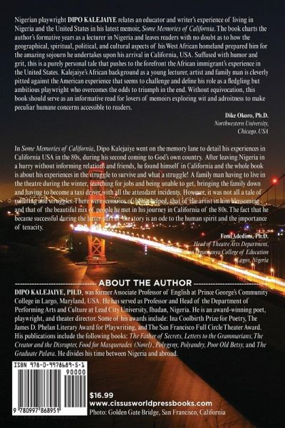 Nigerian playwright DIPO KALEJAIYE relates an educator and writer's experience of living in Nigeria and the United States in his latest memoir, Some Memories of California. The book charts the author's formative years as a lecturer in Nigeria and leaves readers with no doubt as to how the geographical, spiritual, political, and cultural aspects of his West African homeland prepared him for the amazing sojourn he undertakes upon his arrival in California, USA. Suffused with humor and grit, this is a purely personal tale that pushes to the forefront the African immigrant's experience in the United States. Kalejaiye's African background as a young lecturer, artist and family man is cleverly pitted against the American experience that seems to challenge and define his role as a fledgling but ambitious playwright who overcomes the odds to triumph in the end. Without equivocation, this book should serve as an informative read for lovers of memoirs exploring wit and adroitness to make peculiar humane concerns accessible to readers.