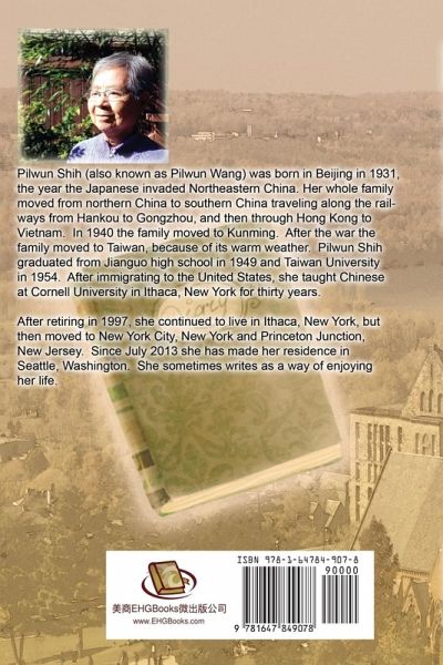 Pilwun Shih (also known as Pilwun Wang) was born in Beijing in 1931, the year the Japanese invaded Northeastern China. Her whole family moved from northern China to southern China traveling along the railways from Hankou to Gongzhou, and then through Hong Kong to Vietnam. In 1940 the family moved to Kunming. After the war the family moved to Taiwan, because of its warm weather. Pilwun Shih graduated from Jianguo high school in 1949 and Taiwan University in 1954. After immigrating to the United States, she taught Chinese at Cornell University in Ithaca, New York for thirty years. After retiring in 1997, she continued to live in Ithaca, New York, but then moved to New York City, New York and Princeton Junction, New Jersey. Since July 2013 she has made her residence in Seattle, Washington. She sometimes writes as a way of enjoying her life. About the author: I lived in Princeton Junction, New Jersey for almost seven years (2007-2013). The landscape of Princeton Junction was different from Ithaca, my home in the US for thirty years. Rather than the immediate hills and waterfalls that I encountered on my daily outings, I walked a terrain full of flatness and street side windings. My walks there were full of twists and bends but I felt my life was going nowhere for me at the age of close to eighty. Fortunately, a senior center was located close to my house. I went to there to do taichi and yoga exercises while also joining a creative writing class. The classes extended my life, but my writing class in particular, also surprisingly deepened my life. I was spurred on to draw from stories and experiences of my long ago past. I tried to recollect those stories from my mother's generation and my own experiences during my early life. Here are the fruits of my creative labors. Anyone who happens by and picks this up to read might say: "Oh, that was when..." ¿¿¿¿1931 - ¿¿¿¿¿¿¿¿¿¿¿¿¿¿¿¿¿¿¿¿¿¿¿¿¿¿¿¿¿¿¿¿¿¿¿¿¿¿¿¿¿¿¿¿¿¿¿¿¿¿¿¿¿¿¿¿¿¿¿¿¿¿¿¿¿¿¿¿¿¿¿¿¿¿¿¿¿¿¿¿¿¿¿¿¿¿¿¿¿¿¿¿¿¿¿¿¿¿¿¿¿¿¿¿¿¿¿¿¿¿¿¿¿¿¿¿¿¿¿¿¿¿¿¿¿¿¿¿¿¿¿¿¿¿¿¿¿¿¿¿¿¿¿¿¿¿¿¿¿¿¿¿¿¿¿¿¿¿¿¿¿¿¿¿¿¿¿¿¿¿¿¿¿¿¿¿¿¿¿¿¿¿¿¿¿¿¿¿¿¿¿¿¿¿¿¿¿¿¿¿¿¿¿¿¿¿¿¿¿¿¿¿¿¿¿¿¿¿¿¿¿¿¿¿¿¿¿¿¿¿¿¿¿¿¿¿¿