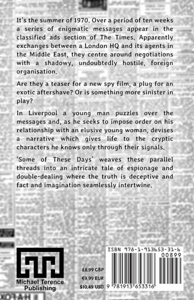 It's the summer of 1970. Over a period of ten weeks a series of enigmatic messages appear in the classified ads section of The Times. Apparently exchanges between a London HQ and its agents in the Middle East, they centre around negotiations with a shadowy, undoubtedly hostile, foreign organisation. Are they a teaser for a new spy film, a plug for an exotic aftershave? Or is something more sinister in play? In Liverpool, a young man puzzles over the messages and, as he seeks to impose order on his relationship with an elusive young woman, devises a narrative which gives life to the cryptic characters he knows only through their signals. 'Some of These Days' weaves these parallel threads into an intricate tale of espionage and double-dealing where the truth is deceptive and fact and imagination seamlessly intertwine.