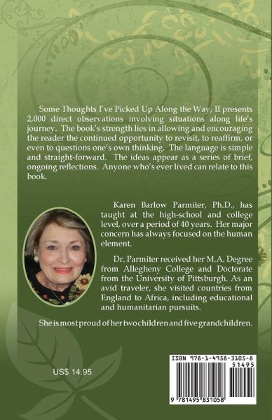 Some Thoughts I Picked Up Along the Way is a collection of ideas and thoughts that have entered my mind during life's good and bad times. These thoughts are directed toward no particular individual or group of individuals, just things that popped into my head as time has gone on. I hope that maybe some of them will speak to you in a positive way and make you think as you move through life. If in some way it makes you think about a time in your life that makes you smile or makes you think, or just makes a moment in time come back to you, then the book has served its purpose.