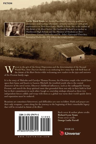 Woven in the grit of the Great Depression and the determination of the Second World War, Some Trust in Chariots is an endearing love story that will thrill fans of the Intents of the Heart Series while welcoming new readers to the joys and sorrows of the Preston family saga. It is the story of Malcolm and Carolyn Thomas Preston, the Christian couple who would later open their home and hearts to Lauren Mitchell, the troubled youth who is the central character of the novel series. Discover childhood influences, such as the unflappable Granny Preston, and search the deep spiritual roots that grounded them not only in their faith in God but in their commitment to each other. Laugh as courtship mishaps abound as these two independent forces collide and weep with them as a global war turns their world upside down and separation must be endured. Reunions are sometimes bittersweet, and difficulties are sure to follow. Faith and prayer are their only weapons.come along for the journey to the beginning of their remarkable legacy that will be revealed in Intents of the Heart.