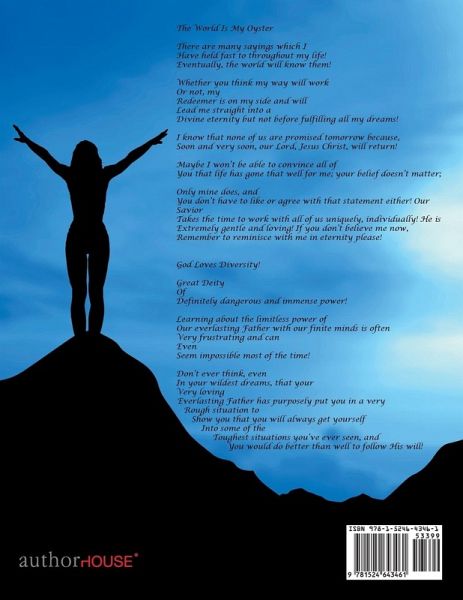 The World Is My Oyster There are many sayings which I Have held fast to throughout my life! Eventually, the world will know them! Whether you think my way will work Or not, my Redeemer is on my side and will Lead me straight into a Divine eternity but not before fulfilling all my dreams! I know that none of us are promised tomorrow because, Soon and very soon, our Lord, Jesus Christ, will return! Maybe I won't be able to convince all of You that life has gone that well for me; your belief doesn't matter; Only mine does, and You don't have to like or agree with that statement either! Our Savior Takes the time to work with all of us uniquely, individually! He is Extremely gentle and loving! If you don't believe me now, Remember to reminisce with me in eternity please! God Loves Diversity! Great Deity Of Definitely dangerous and immense power! Learning about the limitless power of Our everlasting Father with our finite minds is often Very frustrating and can Even Seem impossible most of the time! Don't ever think, even In your wildest dreams, that your Very loving Everlasting Father has purposely put you in a very Rough situation to Show you that you will always get yourself Into some of the Toughest situations you've ever seen, and You would do better than well to follow His will!