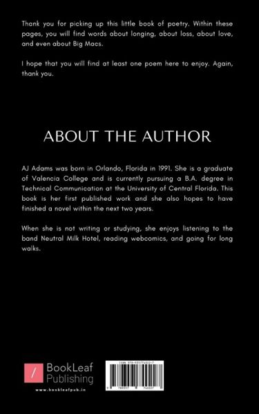 ""Thank you for picking up this little book of poetry. Within these pages, you will find words about longing, about loss, about love, and even about Big Macs. I hope that you will find at least one poem here to enjoy. Again, thank you.""