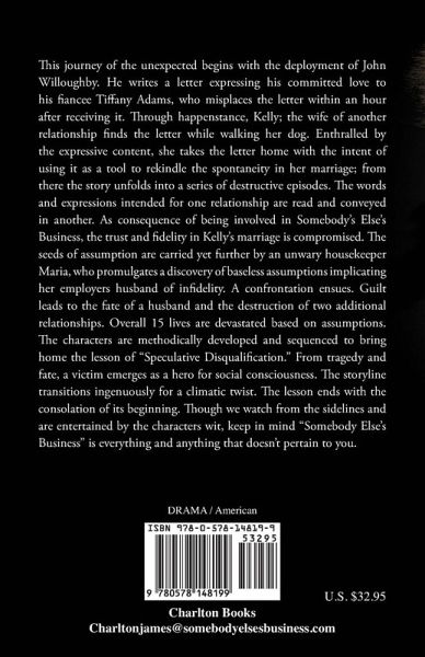 Somebody Else's Business, embarks on the lives of everyday people facing dilemmas of circumstance and fate. The fascinating journey begins with John and Kelly's wholesome love affair and their expectant wedding date. Circumstance begins with the deployment of John, and the acceptance and trust with Tiffany. John sends Tiffany a letter of reassurance on his love, drizzling from one relationship to another, snowballing the lives of others bringing guilt, destroying trust, honor and relationships. How do we handle somebody Else's Business? Whether measured with the soft touch or the hard hand, prepare for the circumstances that follow when dealing with Somebody Else's Business.