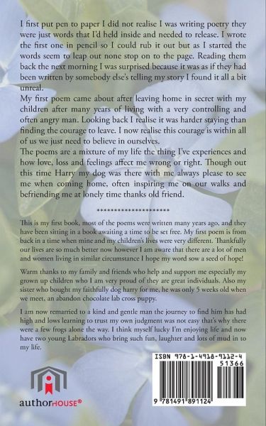 I first put pen to paper I did not realise I was writing poetry they were just words that I'd held inside and needed to release. I wrote the first one in pencil so I could rub it out but as I started the words seem to leap out none stop on to the page. Reading them back the next morning I was surprised because it was as if they had been written by somebody else's telling my story I found it all a bit unreal. My first poem came about after leaving home in secret with my children after many years of living with a very controlling and often angry man. Looking back I realise it was harder staying than finding the courage to leave. I now realise this courage is within all of us we just need to believe in ourselves. The poems are a mixture of my life the thing I've experiences and how love, loss and feelings affect me wrong or right. Though out this time Harry my dog was there with me always please to see me when coming home, often inspiring me on our walks and befriending me at lonely time thanks old friend