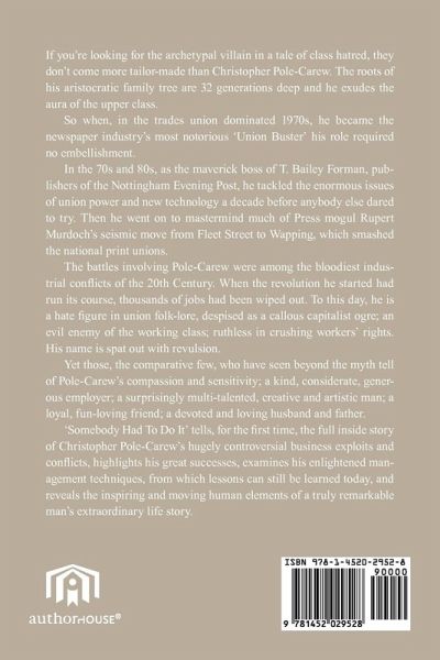 IF you're looking for the archetypal villain in a tale of class hatred, they don't come any more tailor-made than Christopher Pole-Carew. The roots of his aristocratic family tree are 32 generations deep and he exudes the aura of the upper class. So when, in the trades union dominated 1970s, he became the newspaper industry's notorious 'Union Buster' his role required no embellishment. In the '70s and '80s, as the maverick boss of T. Bailey Forman Ltd, publishers of the Nottingham Evening Post, he tackled the enormous issues of union power and new technology a decade before anybody else dared to try. Then he went on to mastermind much of Press mogul Rupert Murdoch's seismic move from Fleet Street to Wapping, smashing the national newspaper unions. The battles involving Pole-Carew were among the bloodiest industrial conflicts of the 20th Century. When the revolution he started had run its course, thousands of jobs had been wiped out. To this day, he is a hate figure in union folk-lore, despised as a callous capitalist ogre; an evil enemy of the working class; ruthless in crushing workers'rights;a name to be spat out with revulsion. Yet those, the comparative few, who have seen beyond the myth tell of Pole-Carew's compassion and sensitivity; a kind, considerate, generous employer; a surprisingly multi-talented, creative and artistic man; a loyal, fun loving friend; a devoted and loving husband and father. 'Somebody Had To Do It' tells, for the first time, the full inside story of Christopher Pole-Carew's hugely controversial business exploits and conflicts; highlights his great successes; examines his enlightened management techniques, from which lessons can still be learned today, and reveals the inspiring and moving human elements of a truly remarkable man's extraordinary life story.