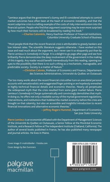 "Most people think that the recent financial crisis is attributable to greedy bankers and low interest rates. The scientific literature suggests otherwise. I have worked on this issue, and read much about the argument (the work of Levine or Rajan to name a few), but I never saw it so eloquently put than by Pierre Lemieux in his ''Somebody in Charge''. It is a delight to go pages after pages and see how brilliantly the author demonstrates the deep involvement of the government in the making-of of this tragedy. Any reader would benefit tremendously from this reading, opening our eyes on the possibility that ''the authorities'' is just a mental creation of our mind trying to escape the naked truth : there is no such a thing as a mechanistic, manageable, and predictable society. Society is a matter of Nature." - Christian Calmès, Professor of Economics and Finance, Université du Québec en Outaouais Administrative ScienceDepartment
