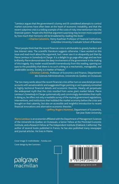 "Most people think that the recent financial crisis is attributable to greedy bankers and low interest rates. The scientific literature suggests otherwise. I have worked on this issue, and read much about the argument (the work of Levine or Rajan to name a few), but I never saw it so eloquently put than by Pierre Lemieux in his ''Somebody in Charge''. It is a delight to go pages after pages and see how brilliantly the author demonstrates the deep involvement of the government in the making-of of this tragedy. Any reader would benefit tremendously from this reading, opening our eyes on the possibility that ''the authorities'' is just a mental creation of our mind trying to escape the naked truth : there is no such a thing as a mechanistic, manageable, and predictable society. Society is a matter of Nature." - Christian Calmès, Professor of Economics and Finance, Université du Québec en Outaouais Administrative ScienceDepartment
