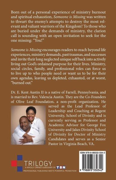 Born out of a personal experience of ministry burnout and spiritual exhaustion, Someone is Missing was written to thwart the enemy's attempts to destroy the most relevant and valiant warriors of the Kingdom! To those who are buried under the demands of ministry, the clarion call is sounding with an open invitation to seek for the one missing: "You!" Someone is Missing encourages readers to reach beyond life experiences, ministry demands, past traumas, and successes and invite their long neglected unique self back into actively living out God's ordained purpose for their lives. Ministry, social circles, family, and professional roles can force us to live up to who people need or want us to be for their own agendas, leaving us depleted, exhausted, or at worst, "burned out."