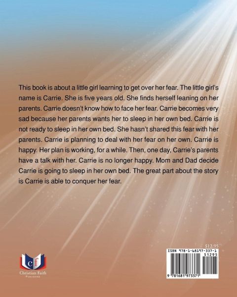 This book is about a little girl learning to get over her fear. The little girl's name is Carrie. She is five years old. She finds herself leaning on her parents. Carrie doesn't know how to face her fear. Carrie becomes very sad because her parents wants her to sleep in her own bed. Carrie is not ready to sleep in her own bed. She hasn't shared this fear with her parents. Carrie is planning to deal with her fear on her own. Carrie is happy. Her plan is working, for a while. Then, one day, Carrie's parents have a talk with her. Carrie is no longer happy. Mom and Dad decide Carrie is going to sleep in her own bed. The great part about the story is Carrie is able to conquer her fear.