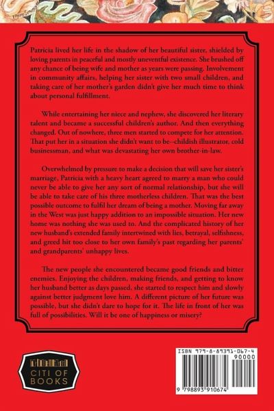 Patricia lived her life in the shadow of her beautiful sister, shielded by loving parents in peaceful and mostly uneventful existence. She brushed off any chance of being wife and mother as years were passing. Involvement in community affairs, helping her sister with two small children, and taking care of her mother's garden didn't give her much time to think about personal fulfillment. While entertaining her niece and nephew, she discovered her literary talent and became a successful children's author. And then everything changed. Out of nowhere, three men started to compete for her attention. That put her in a situation she didn't want to be--childish illustrator, cold businessman, and what was devastating her own brother-in-law. Overwhelmed by pressure to make a decision that will save her sister's marriage, Patricia with a heavy heart agreed to marry a man who could never be able to give her any sort of normal relationship, but she will be able to take care of his three motherless children. That was the best possible outcome to fulfil her dream of being a mother. Moving far away in the West was just happy addition to an impossible situation. Her new home was nothing she was used to. And the complicated history of her new husband's extended family intertwined with lies, betrayal, selfishness, and greed hit too close to her own family's past regarding her parents' and grandparents' unhappy lives. The new people she encountered became good friends and bitter enemies. Enjoying the children, making friends, and getting to know her husband better as days passed, she started to respect him and slowly against better judgment love him. A different picture of her future was possible, but she didn't dare to hope for it. The life in front of her was full of possibilities. Will it be one of happiness or misery?