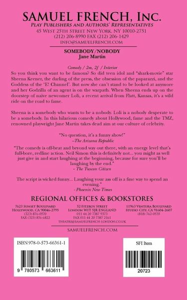ComedyCharacterS: 2 male, 2 femaleInteriorSo you think you want to be famous? So did teen idol and "shark-movie" star Sheena Keener, the darling of the press, the obsession of the paparazzi, and the Goddess of the 'E! Channel'. But now she can't stand to be looked at anymore and her Godzilla of an agent is on the warpath. When Sheena ends up on the doorstep of naïve newcomer Loli, a recent arrival from Flatt, Kansas, it's a wild ride on the road to fame. Sheena is a somebod