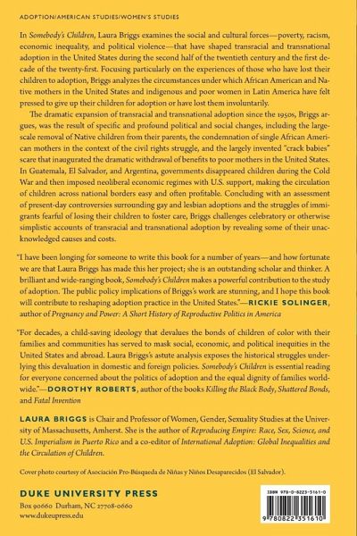 In Somebody's Children, Laura Briggs examines the social and cultural forces-poverty, racism, economic inequality, and political violence-that have shaped transracial and transnational adoption in the United States during the second half of the twentieth century and the first decade of the twenty-first. Focusing particularly on the experiences of those who have lost their children to adoption, Briggs analyzes the circumstances under which African American and Native mothers in the United States and indigenous and poor women in Latin America have felt pressed to give up their children for adoption or have lost them involuntarily. The dramatic expansion of transracial and transnational adoption since the 1950s, Briggs argues, was the result of specific and profound political and social changes, including the large-scale removal of Native children from their parents, the condemnation of single African American mothers in the context of the civil rights struggle, and the largely invented "crack babies" scare that inaugurated the dramatic withdrawal of benefits to poor mothers in the United States. In Guatemala, El Salvador, and Argentina, governments disappeared children during the Cold War and then imposed neoliberal economic regimes with U.S. support, making the circulation of children across national borders easy and often profitable. Concluding with an assessment of present-day controversies surrounding gay and lesbian adoptions and the struggles of immigrants fearful of losing their children to foster care, Briggs challenges celebratory or otherwise simplistic accounts of transracial and transnational adoption by revealing some of their unacknowledged causes and costs.
