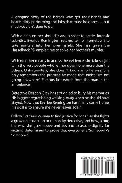 A gripping story of the heroes who get their hands and hearts dirty performing the jobs that must be done . . . but most wouldn't dare to do. With a chip on her shoulder and a score to settle, forensic scientist Everlee Remington returns to her hometown to take matters into her own hands. She has given the Hasselback PD ample time to solve her brother's murder to no avail. With no other means to access the evidence, she takes a job with the very people who let her down; one more than the others. Unfortunately, she doesn't know who he was. She only remembers the promise he made that night: "I'm not going anywhere".Famous last words from the man in the ambulance. Detective Deacon Gray has struggled to bury his memories of Everlee Remington. His biggest regret is walking away when he should have stayed. Now that she has finally come home, his goal is to ensure she never leaves again. Follow Everlee's journey to find justice for Jonah as she fights a growing attraction to the cocky detective, and how along the way, she goes above and beyond to assure dignity for victims; determined to prove that everyone is "Somebody's Someone". Trigger warnings: 18+. Adult material to include sexual content, murder, assault, and explicit crime scene investigations.